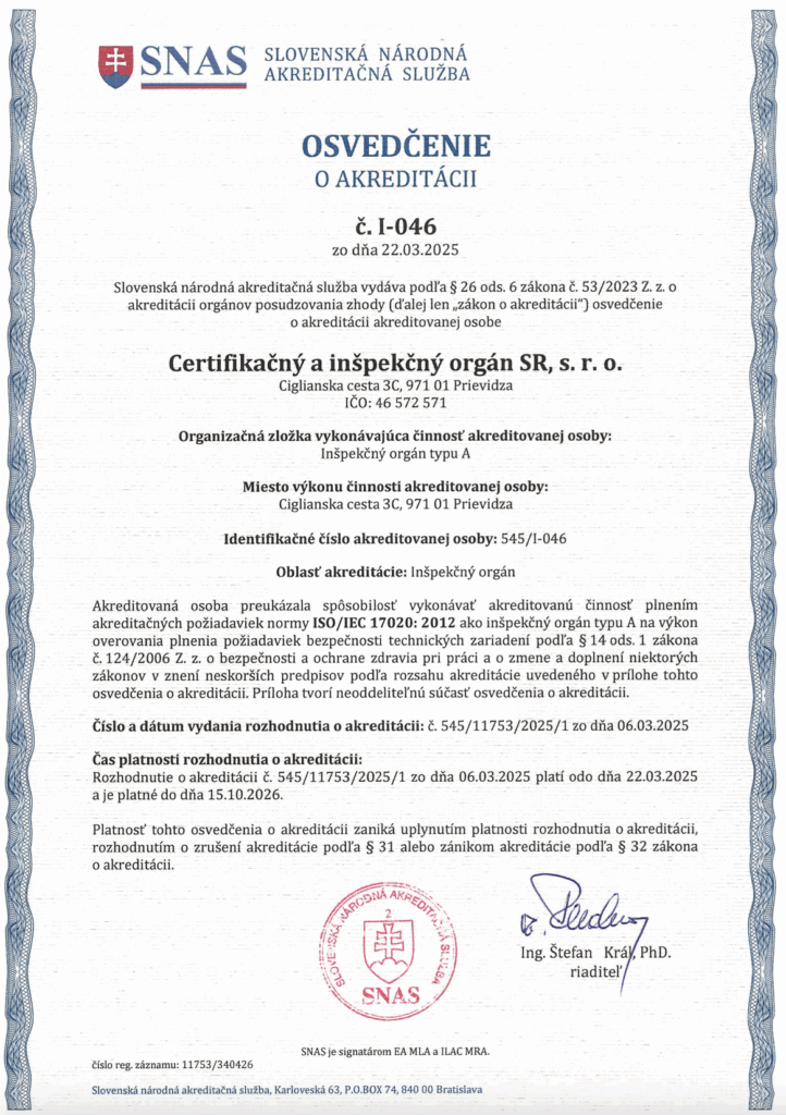 Osvedčenie o akreditácii na výkon overovania plnenia požiadaviek bezpečnosti technických zariadení podľa § 14 ods. 1 zákona č. 124/2006 Z.z. o bezpečnosti a ochrane zdravia pri práci a o zmene a doplnení niektorých zákonov v znení neskorších predpisov.